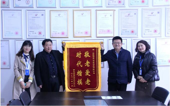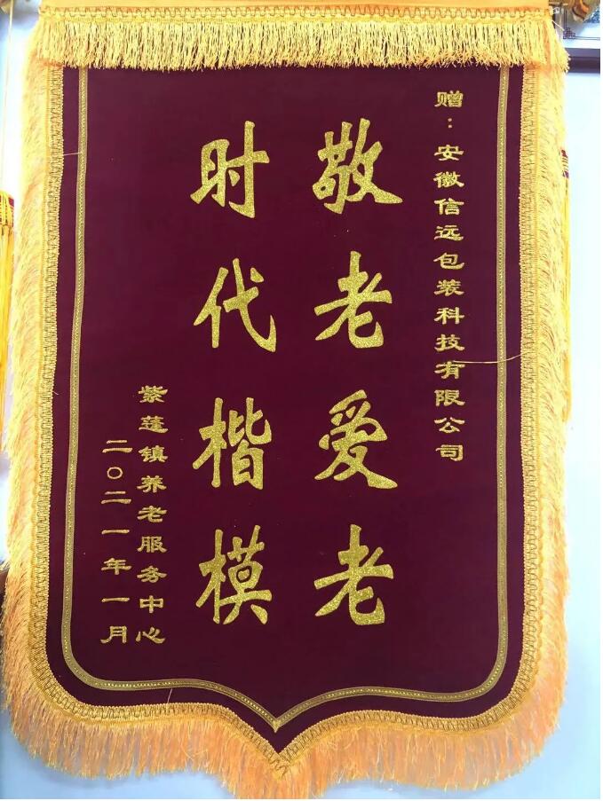肥西縣紫蓬鎮(zhèn)敬老院唐院長等一行人專程趕到公司,贈(zèng)送印有“時(shí)代楷模,敬老愛老”的錦旗,感謝安徽信遠(yuǎn)包裝科技有限公司為肥西縣紫蓬鎮(zhèn)敬老院孤寡老人送去春天般的溫暖,公司董事長倪合青出席了授旗儀式并合影留念。