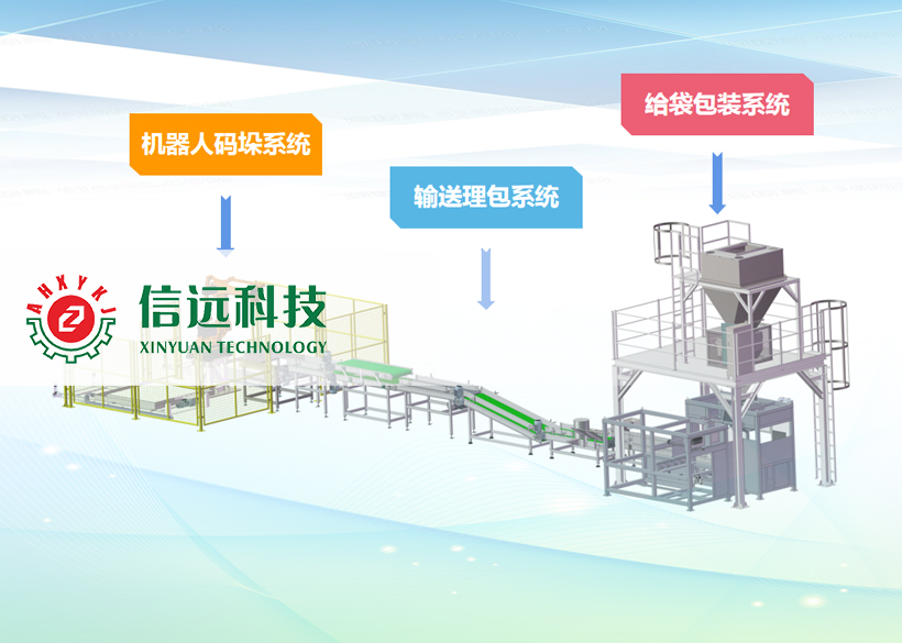 ■集自動給袋、上袋、夾袋、計量、充填、縫包、輸送、倒包、振實、壓平、理包、機器人碼垛、托盤庫于一體