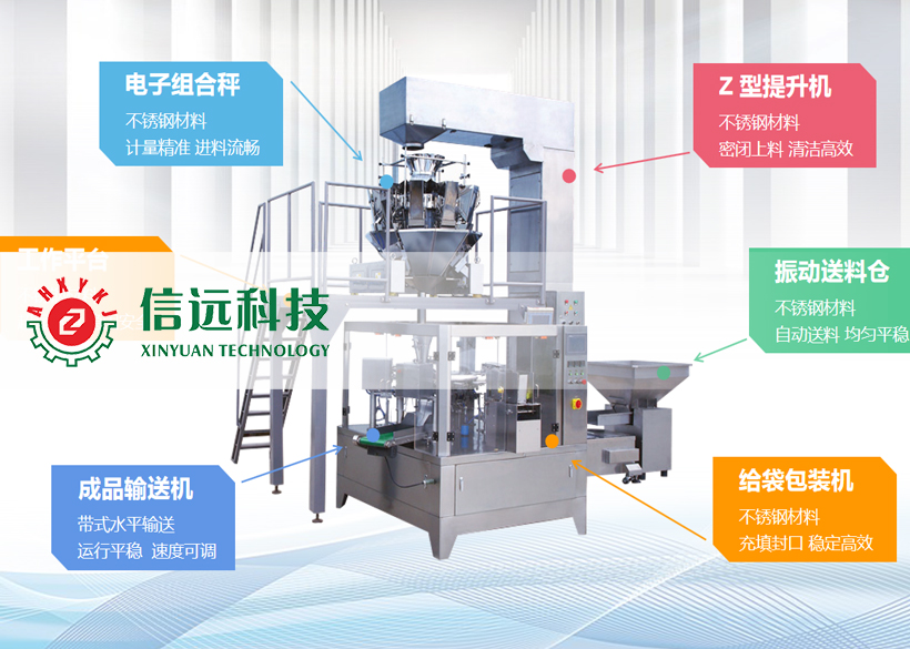 信遠(yuǎn)科技顆粒料全自動(dòng)旋轉(zhuǎn)式給袋包裝機(jī)組,是由密閉Z型提升機(jī)、電子計(jì)量組合秤、多工位旋轉(zhuǎn)式給袋包裝機(jī)和成品輸送機(jī)組成??梢园b單袋克重在30-5000g范圍之間的顆粒狀物料,生產(chǎn)企業(yè)可以根據(jù)自己的需求選擇不同的包裝機(jī)型號(hào)。這套機(jī)組設(shè)備適合各種顆粒狀、片狀、條狀、圓狀、塊狀及不規(guī)則形狀等物料的定量包裝,具有自動(dòng)完成送料、計(jì)量、給袋、充填、封口、打印、計(jì)數(shù)、輸送等一系列功能,是食品、化工、農(nóng)資等行業(yè)提高包裝生產(chǎn)效率,打造綠色環(huán)保車(chē)間,提升包裝檔次的新型自動(dòng)化裝備。