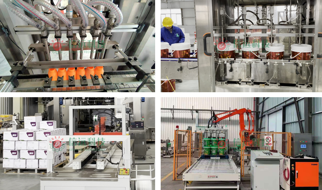 瓶裝灌裝系統(tǒng)適用于100-1000ml容量范圍內(nèi)的液體肥產(chǎn)品灌裝。可以自動(dòng)完成理瓶進(jìn)瓶和計(jì)量灌裝,當(dāng)瓶?jī)?nèi)重量達(dá)到設(shè)定值時(shí),自動(dòng)停止灌注,在輸送系統(tǒng)的推動(dòng)下,出瓶至自動(dòng)上蓋旋蓋、鋁箔封口、噴碼貼標(biāo)和封箱打包工段,完成成品下線。桶裝灌裝系統(tǒng)適用于5-30L容量范圍內(nèi)的方桶、圓桶、廣口桶和小口桶的液體肥產(chǎn)品灌裝??梢宰詣?dòng)完成定位進(jìn)桶、稱重灌裝、上蓋壓蓋、噴碼追溯和機(jī)器人碼桶等不同工序作業(yè)。