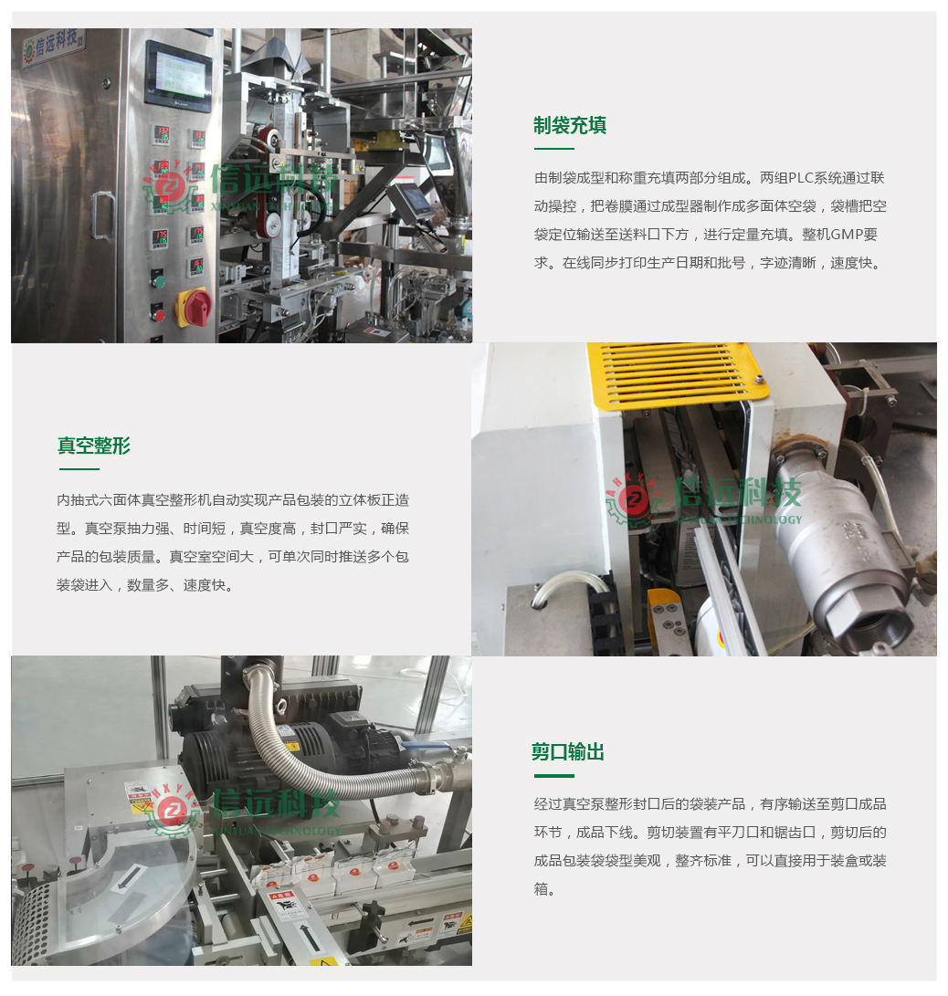全自動六面體真空整形包裝機(jī)組可以實現(xiàn)全自動上料、制袋、稱重、充填、整形、抽真空、封口、剪袋口、成品輸送于一體。通過內(nèi)抽真空的方式,將散放物料包裝成為單袋克重在100-1000g范圍之間的具有高附加值的六面體定重成型小包裝。六面體真空整形包裝機(jī)組廣泛應(yīng)用于大米、雜糧等顆粒產(chǎn)品以及咖啡、酵母等粉料產(chǎn)品的真空包裝,袋型美觀,包裝速度快,運行穩(wěn)定,密封效果好,保鮮保質(zhì)時間長。適合批量生產(chǎn),便于裝盒、裝箱或直接零售。