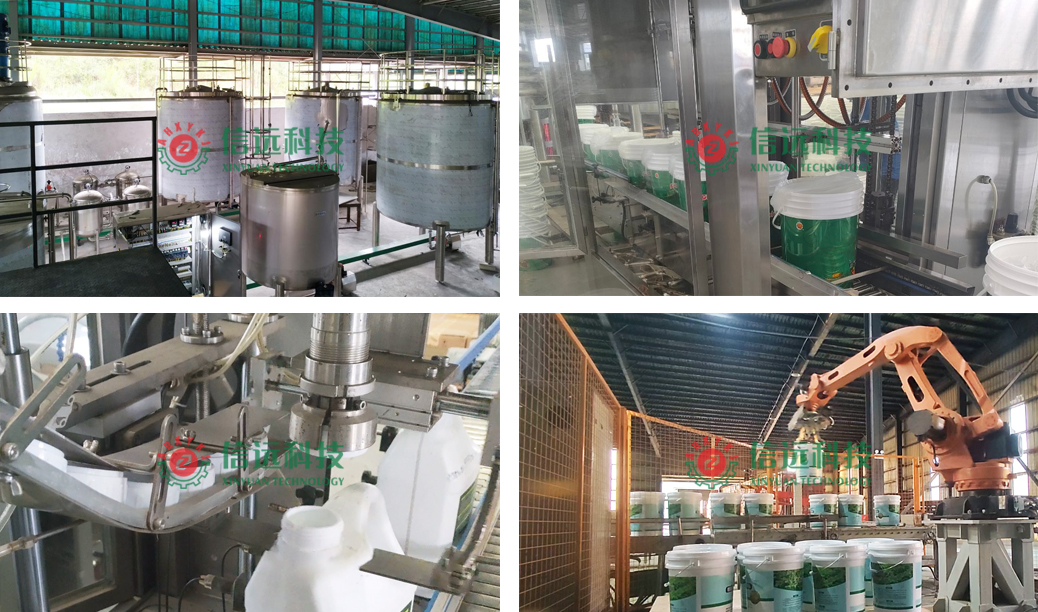信遠科技液體海藻魚蛋白肥成套生產(chǎn)設(shè)備,主要由原料預處理、酶解螯合、成品儲液、灌裝碼垛四大裝置工段組成。首先,藻類魚類主原料,需要按照技術(shù)標準進行預處理生產(chǎn);達到配料要求的海藻原料和魚類原料經(jīng)降解螯合,過濾除渣后,分別制備成海藻降解液和魚蛋白降解液;同時,把需要添加的中微量元素有益質(zhì)進行攪拌混合,制備成輔料液。然后主料液和輔料液按照質(zhì)量配比,先后投入到反應釜內(nèi)進行復配攪拌螯合,制成液體海藻魚蛋白肥料產(chǎn)品。灌裝碼垛工段可以實現(xiàn)桶裝和瓶裝的自動灌裝、封口、噴碼、裝箱和機器人碼垛作業(yè)。