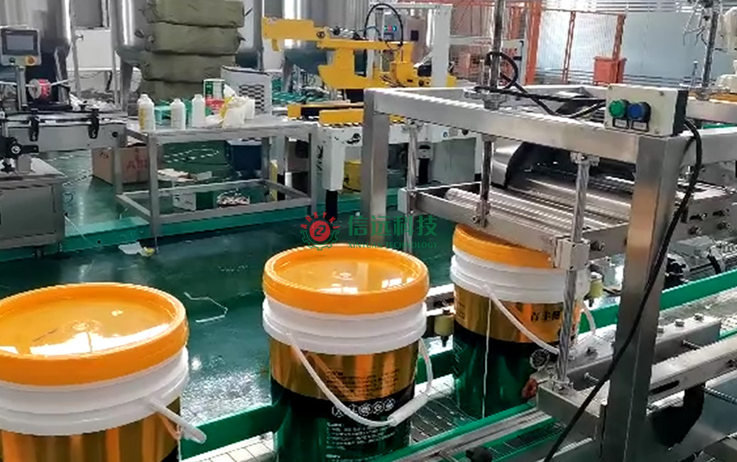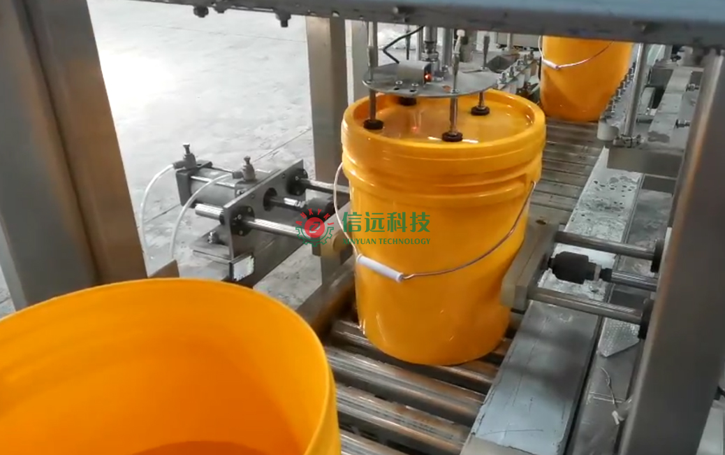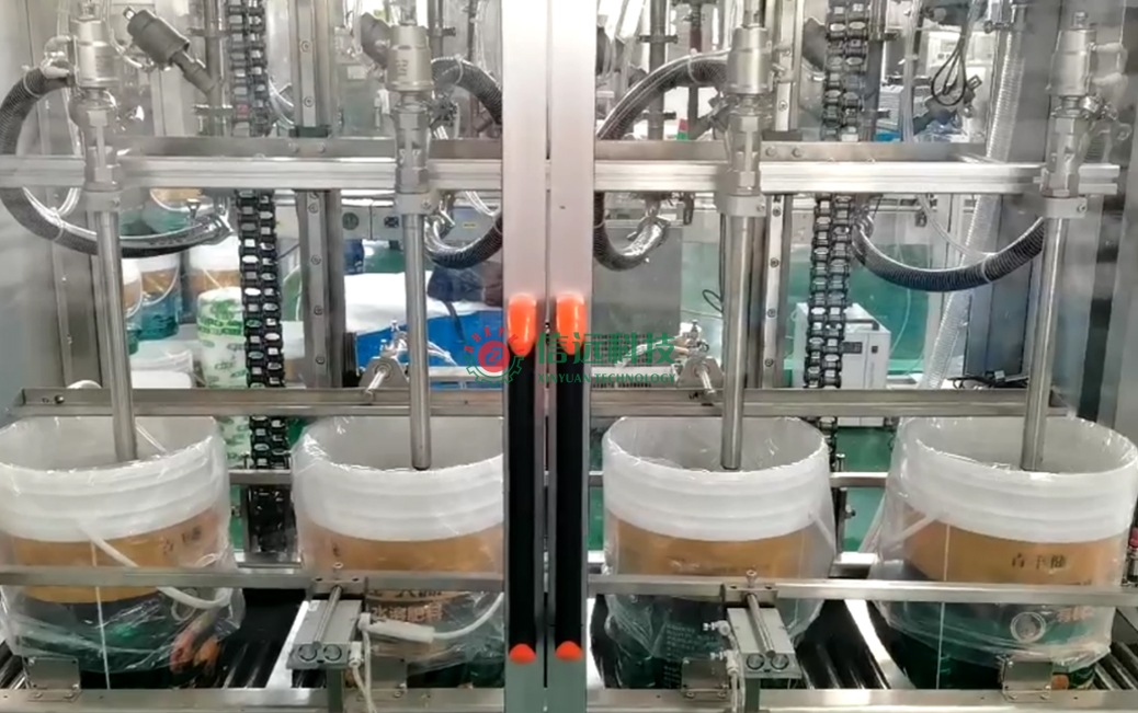 下面我們來具體講一下桶裝全自動灌裝機。該機主要由輸送輥道、緩存液缸、定位灌裝、電子稱重等幾大部分組成。進桶方式是把空桶有序放置在定位槽內(nèi),通過輥道帶動,精準輸送至灌裝頭下方,進桶的速度和間隔,與灌裝系統(tǒng)配套聯(lián)動,同步控制。該機上方設(shè)置有供料液缸,液料的進料方式為重力自流式;灌裝頭采用電機驅(qū)動下潛,邊灌裝邊提升,可有效減少泡沫產(chǎn)生;灌裝頭可左右、上下調(diào)節(jié),灌裝速度可調(diào),設(shè)計有防滴漏裝置;灌裝容量采用稱重傳感器計量方式,精度高、誤差小。該機采用PLC智能系統(tǒng)控制,具有桶體自動定位、無桶不灌裝、灌裝精度高等特點,同時具有實時監(jiān)控,實時調(diào)整和故障提示功能,可以自動完成進桶計數(shù)、計量灌裝、輸送出桶等一系列操作。