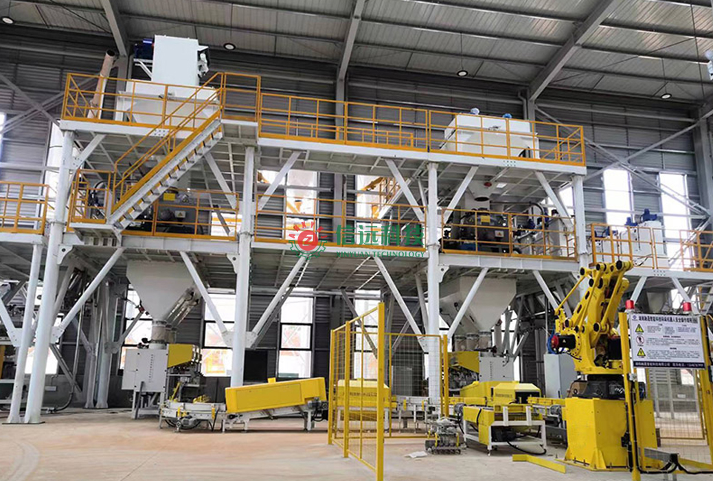 信遠科技全自動膩子粉生產(chǎn)線,采用高效螺帶干粉混合機,該機是在多代機型的技術(shù)基礎(chǔ)上融合多種優(yōu)勢研發(fā)而制,具有自動喂料,氣動放料,筒壁無積塊、無死角的優(yōu)良性能。年產(chǎn)兩到三萬噸左右的小噸位膩子粉生產(chǎn)設(shè)備,一般情況下會用到4-6個原料罐,合理滿足各種配料的供給需求。計量系統(tǒng)在計量螺旋的配合下,把料倉中的原料導(dǎo)入計量倉,通過傳感器的數(shù)據(jù)反饋,實現(xiàn)計量包裝。輸送線配備整形、清灰、噴碼多道工序,保證每一袋產(chǎn)品外觀干凈整潔、形狀整齊化一,然后碼垛、纏繞覆膜。大大提高出廠產(chǎn)品的外觀檔次,實實在在的增加了產(chǎn)品的市場競爭力。
