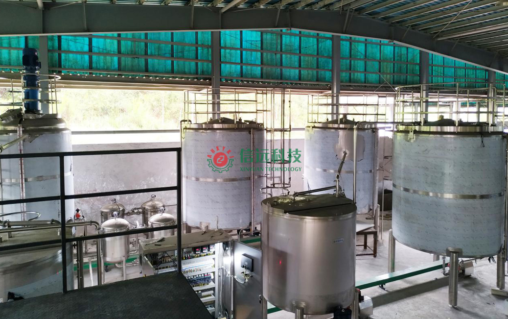 信遠科技液體魚蛋白肥成套生產(chǎn)設備,主要由原料預處理、酶解螯合、成品儲液、灌裝碼垛四大裝置工段組成。首先,藻類魚類主原料,需要按照技術標準進行預處理生產(chǎn);達到配料要求的魚類原料經(jīng)降解螯合,過濾除渣后,分別制備成魚蛋白降解液;同時,把需要添加的中微量元素有益質進行攪拌混合,制備成輔料液。然后主料液和輔料液按照質量配比,先后投入到反應釜內進行復配攪拌螯合,制成液體魚蛋白肥料產(chǎn)品。灌裝碼垛工段可以實現(xiàn)桶裝和瓶裝的自動灌裝、封口、噴碼、裝箱和機器人碼垛作業(yè)。