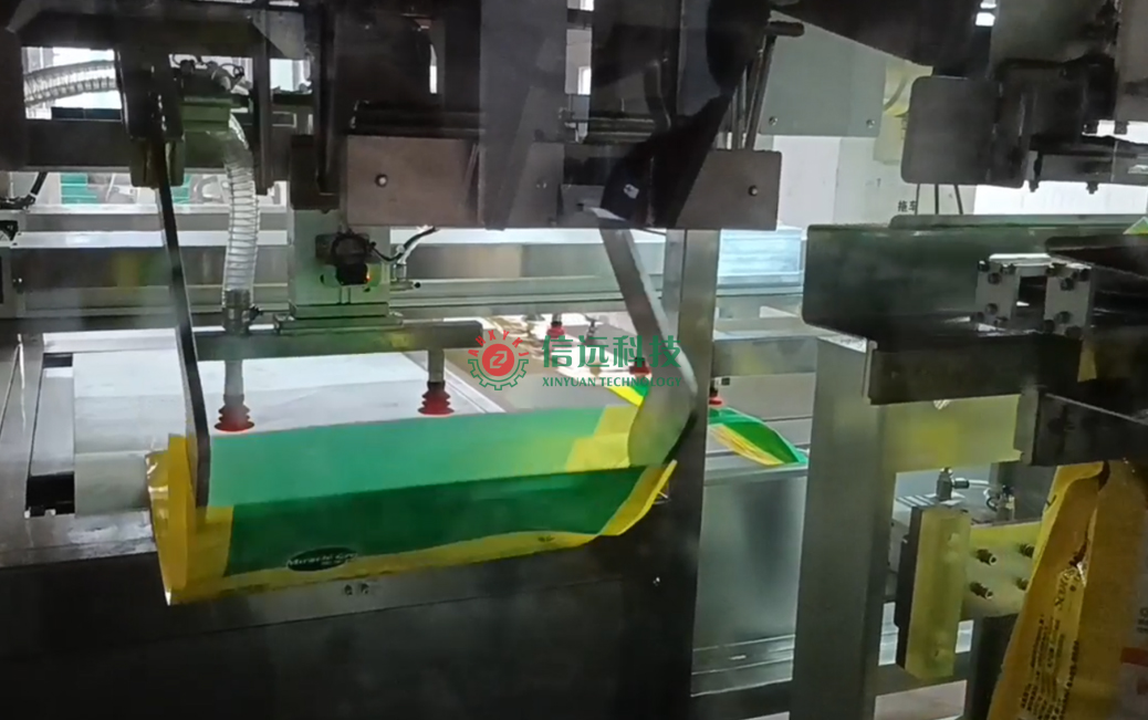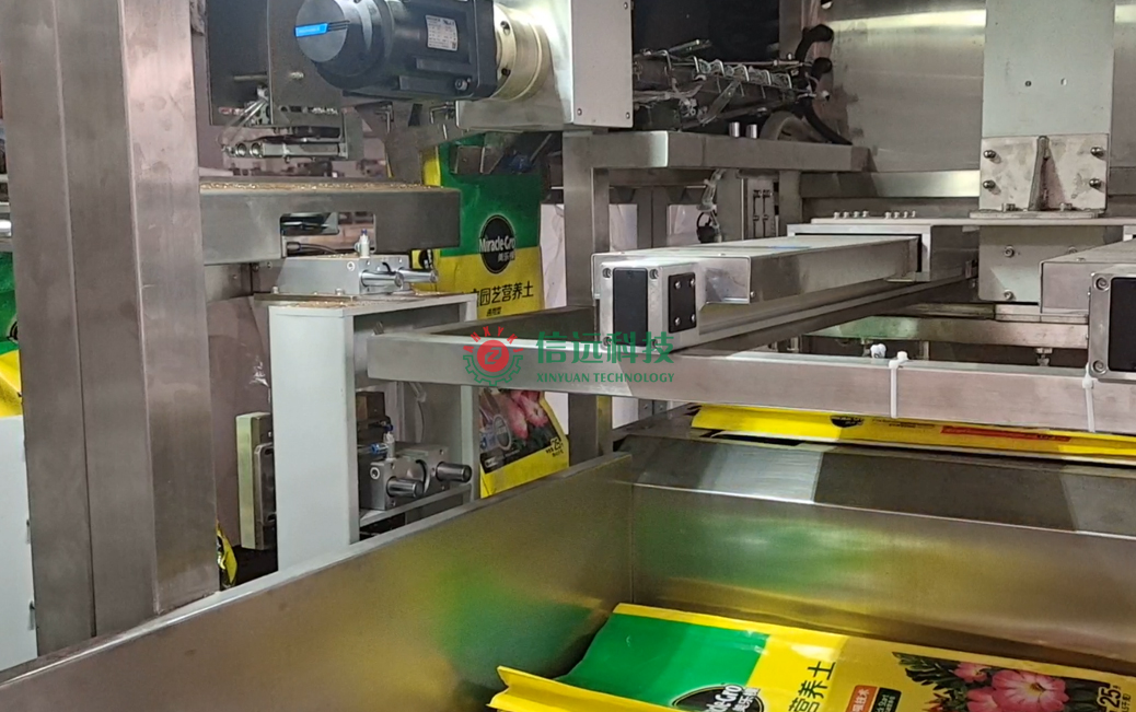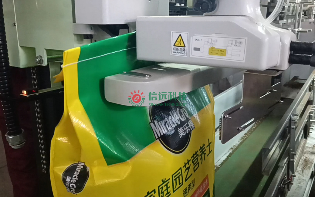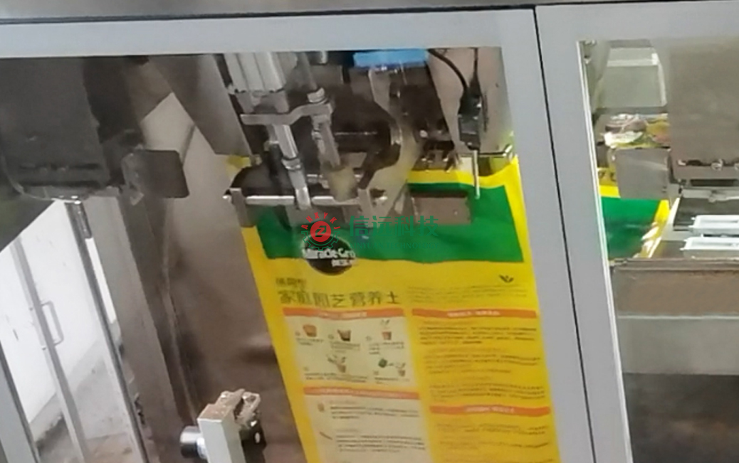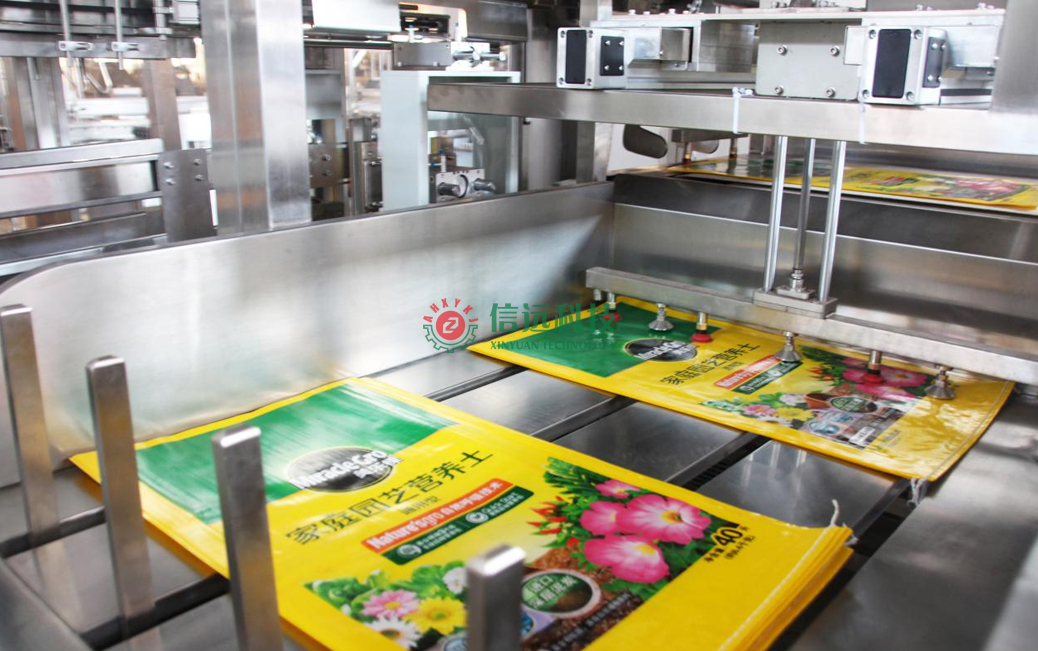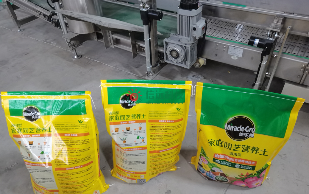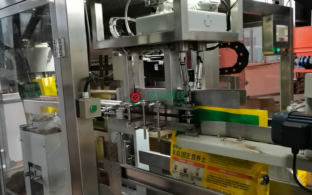 安徽信遠(yuǎn)包裝科技有限公司作為國(guó)內(nèi)知名的農(nóng)資農(nóng)化設(shè)備專業(yè)制造商,按約為該品牌營(yíng)養(yǎng)土生產(chǎn)商提供了成套的自動(dòng)化包裝機(jī)設(shè)備,該設(shè)備是一套給袋式重袋包裝系統(tǒng)。生產(chǎn)流程是配方原料通過(guò)計(jì)量料倉(cāng)喂料至重袋包裝機(jī),在前端上袋機(jī)的配合下,自動(dòng)完成取袋、上袋、套袋、夾袋、計(jì)量、充填、抱袋、振實(shí)等作業(yè);包裝機(jī)后端與縫包機(jī)相聯(lián),在導(dǎo)袋機(jī)構(gòu)和皮帶輸送機(jī)的配合下,自動(dòng)完成移栽、導(dǎo)袋、折邊、縫合、剪線等工序,完成成品輸出。