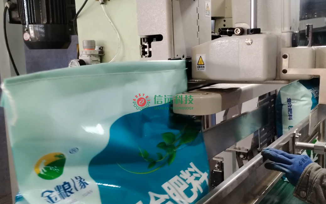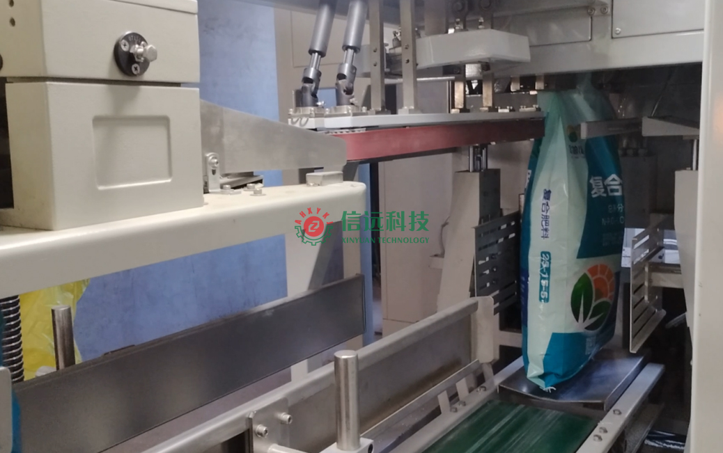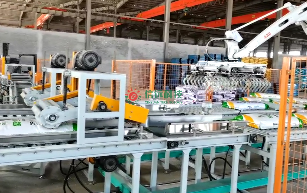 安徽信遠(yuǎn)包裝科技有限公司設(shè)計(jì)制造的全自動(dòng)包裝碼垛生產(chǎn)線設(shè)備,是一套重袋包裝碼垛系統(tǒng),由上袋機(jī)、包裝機(jī)、縫包機(jī)、噴碼機(jī)、輸送理包系統(tǒng)、碼垛機(jī)器人和軌道托盤庫(kù)等裝置組成,可以自動(dòng)完成取袋、上袋、開袋、套袋、夾袋和計(jì)量充填,袋內(nèi)重量達(dá)到設(shè)定值時(shí),自動(dòng)停止充填并松袋落袋,抱袋裝置自動(dòng)推送至縫包機(jī)前,完成包裝袋封口。成品袋在輸送過(guò)程中,自動(dòng)完成倒包、振實(shí)、壓平等理包整形后,機(jī)器人進(jìn)行抓取碼垛,叉車搬運(yùn)入庫(kù)。