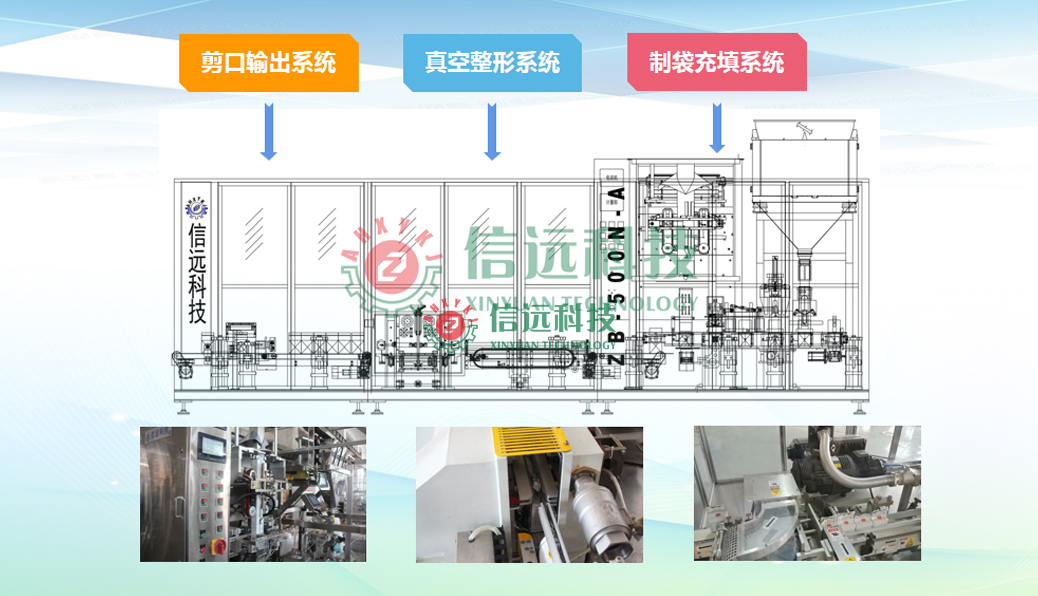 信遠科技全自動制袋包裝機組,可以生產(chǎn)粉料、顆粒料、液體料,整機結(jié)構(gòu)采用不銹鋼材質(zhì)制造。該機由PLC程序控制,具有自動完成送料、計量、制袋、充填、封口、切包、打印、計數(shù)、輸送等一系列功能,智能觸摸屏可中英文操作,操作直觀簡便。包裝機采用高精度伺服運膜系統(tǒng),配合光電自動定位跟蹤系統(tǒng),運膜平穩(wěn),確保制作袋型美觀結(jié)實。