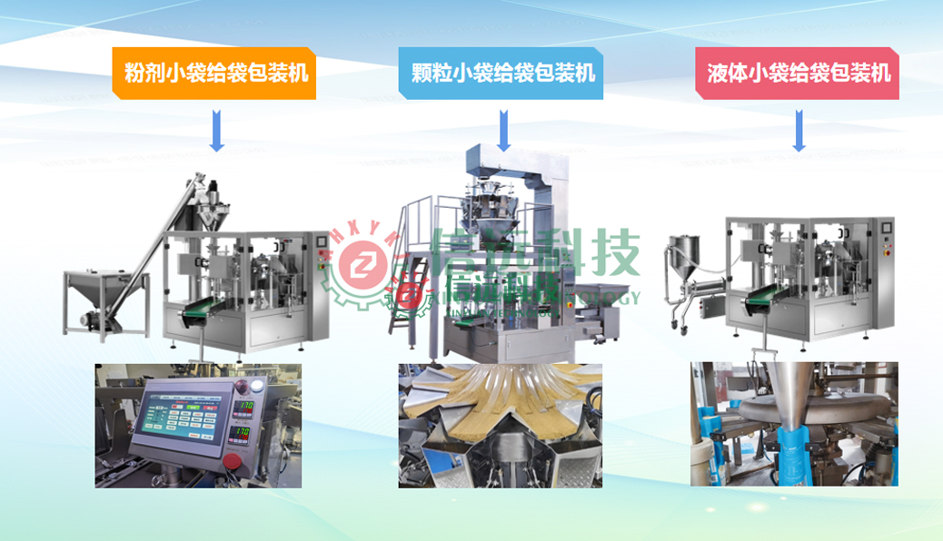 信遠科技全自動給袋包裝機組,整機結(jié)構(gòu)同樣采用不銹鋼材質(zhì)制造。該機具有自動完成送料、計量、給袋、充填、封口、打印、計數(shù)、輸送等一系列功能,可以生產(chǎn)粉料、顆粒料、液體料。旋轉(zhuǎn)式的多工位給袋包裝機采用高精度伺服系統(tǒng)帶動主軸運轉(zhuǎn),袋寬大小可以一鍵調(diào)節(jié),多組機夾跟隨袋寬同步調(diào)節(jié),包裝過程通過變頻調(diào)速裝置,輕松實現(xiàn)穩(wěn)定運行。