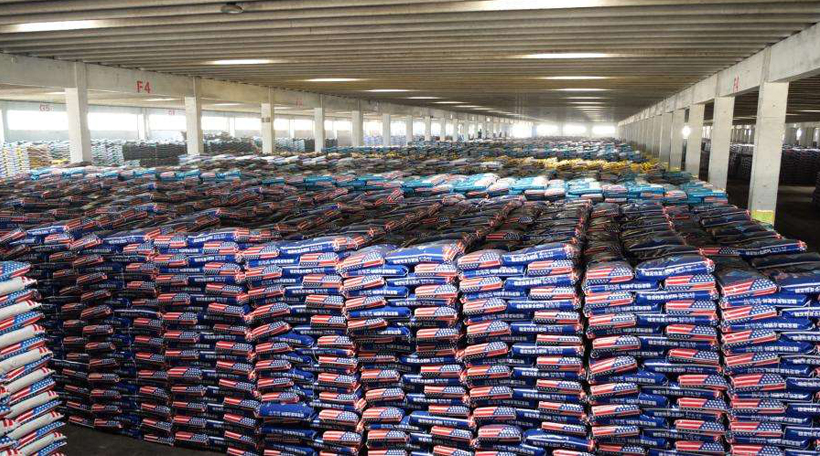 這套生產(chǎn)線設(shè)備是原料經(jīng)過人工投料后,配混設(shè)備會把不同配方的物料元素按照不同的配置比例進行自動配料和自動混合?;旌暇鶆蚝蟮脑陷斔椭涟b機上方的儲料倉斗內(nèi),倉斗內(nèi)的物料通過快慢兩級螺旋給料的方式充填進包裝袋中,包裝過程為全自動化作業(yè),無需人工參與,即可完成自動上袋、夾袋和充填物料,待稱重傳感器檢測到袋內(nèi)物料重量達到設(shè)定數(shù)值時,自動停止充填、并自動松袋落袋,落在輸送帶上的包裝袋將會自動運送至自動折邊縫包機前進行縫包成品。成品袋在輸送過程中,自動完成倒包、振實、壓平等理包整形后,由機器人完成碼垛入庫,日產(chǎn)量可以達到100噸左右。