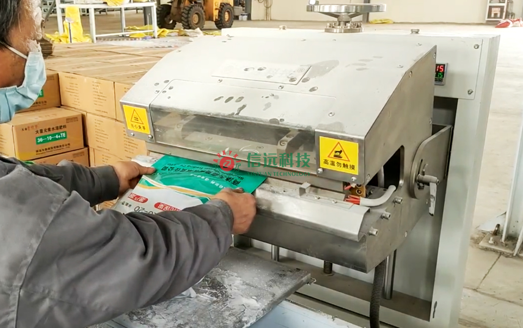 第三種封口設(shè)備,是一種半自動的熱封口機(jī),結(jié)構(gòu)簡單、使用方便,只需要人工整理袋口,放入熱封機(jī)構(gòu),即可完成封口。該機(jī)采用雙溫控儀表分別控制前后加熱塊,溫度控制準(zhǔn)確,溫度可調(diào),熱封口時間可數(shù)字設(shè)定;通過電磁閥控制氣缸來實現(xiàn)封口塊的張開和閉合動作,控制準(zhǔn)確,適合一字平口袋和M折邊袋的熱封口使用;封口樣式可以是網(wǎng)紋或直線條紋,同時可配鋼印打碼;機(jī)架高度調(diào)節(jié)方便,適合不同尺寸的水溶肥包裝袋。