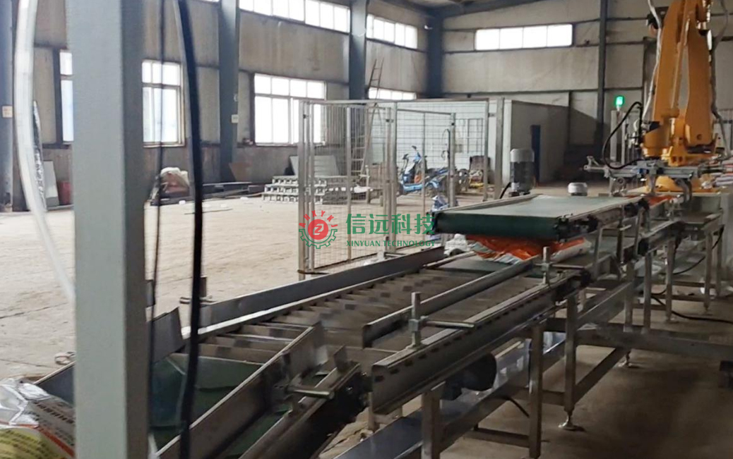 安徽信遠(yuǎn)包裝科技有限公司設(shè)計(jì)制造的摻混肥全自動包裝碼垛生產(chǎn)線設(shè)備,是一套重袋包裝碼垛系統(tǒng),由上袋機(jī)、包裝機(jī)、縫包機(jī)、噴碼機(jī)、輸送理包系統(tǒng)和碼垛機(jī)器人等裝置組成,可以自動完成取袋、上袋、開袋、套袋、夾袋和計(jì)量充填,袋內(nèi)重量達(dá)到設(shè)定值時,自動停止充填并松袋落袋,抱袋裝置自動移栽至縫包機(jī)前,完成包裝袋封口。成品袋在輸送過程中,自動完成倒包、振實(shí)、壓平等理包整形后,機(jī)器人進(jìn)行抓包碼垛,叉車搬運(yùn)入庫。